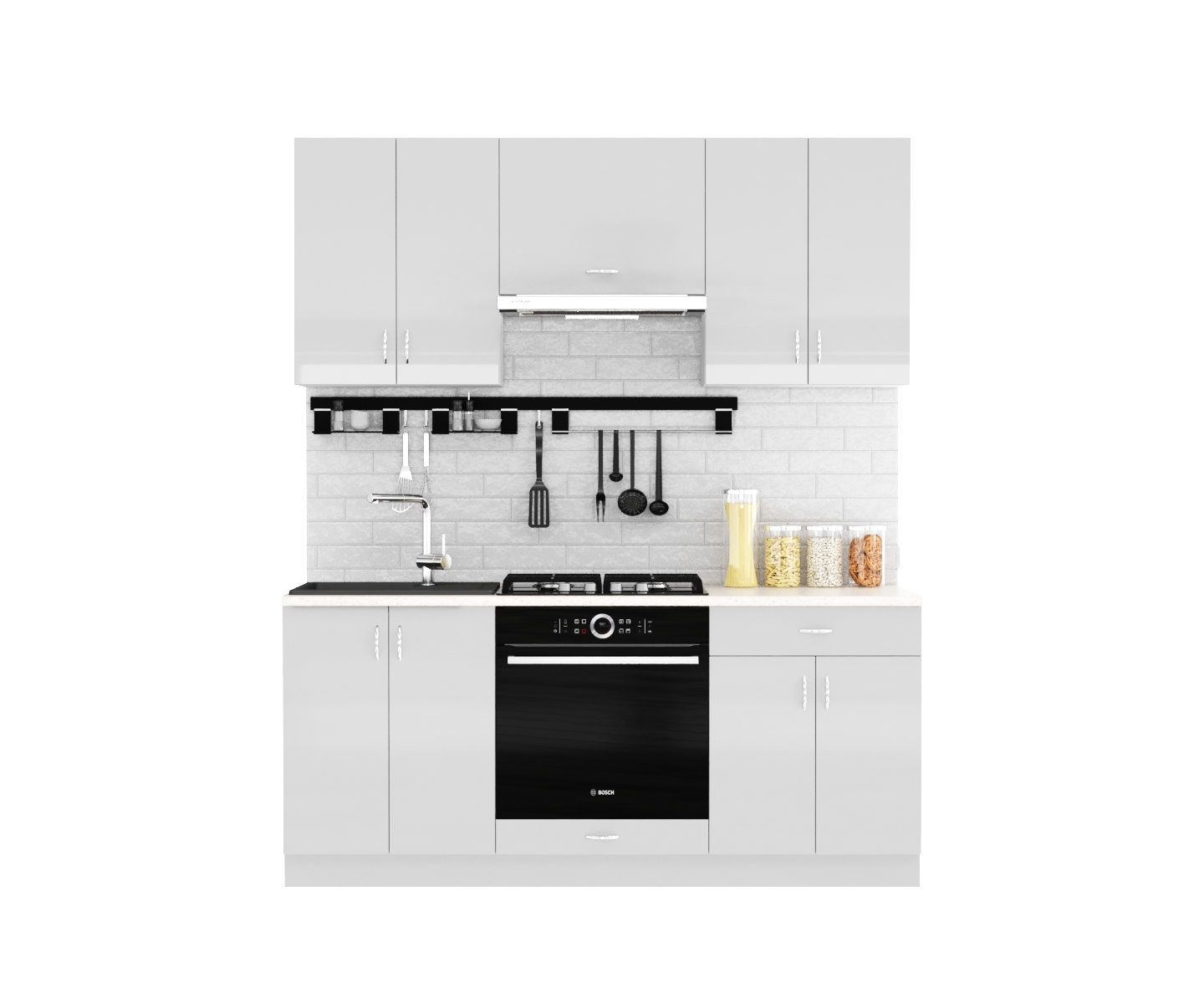 Белые фасады с фрезеровкой. Ширина кухни 220 см.