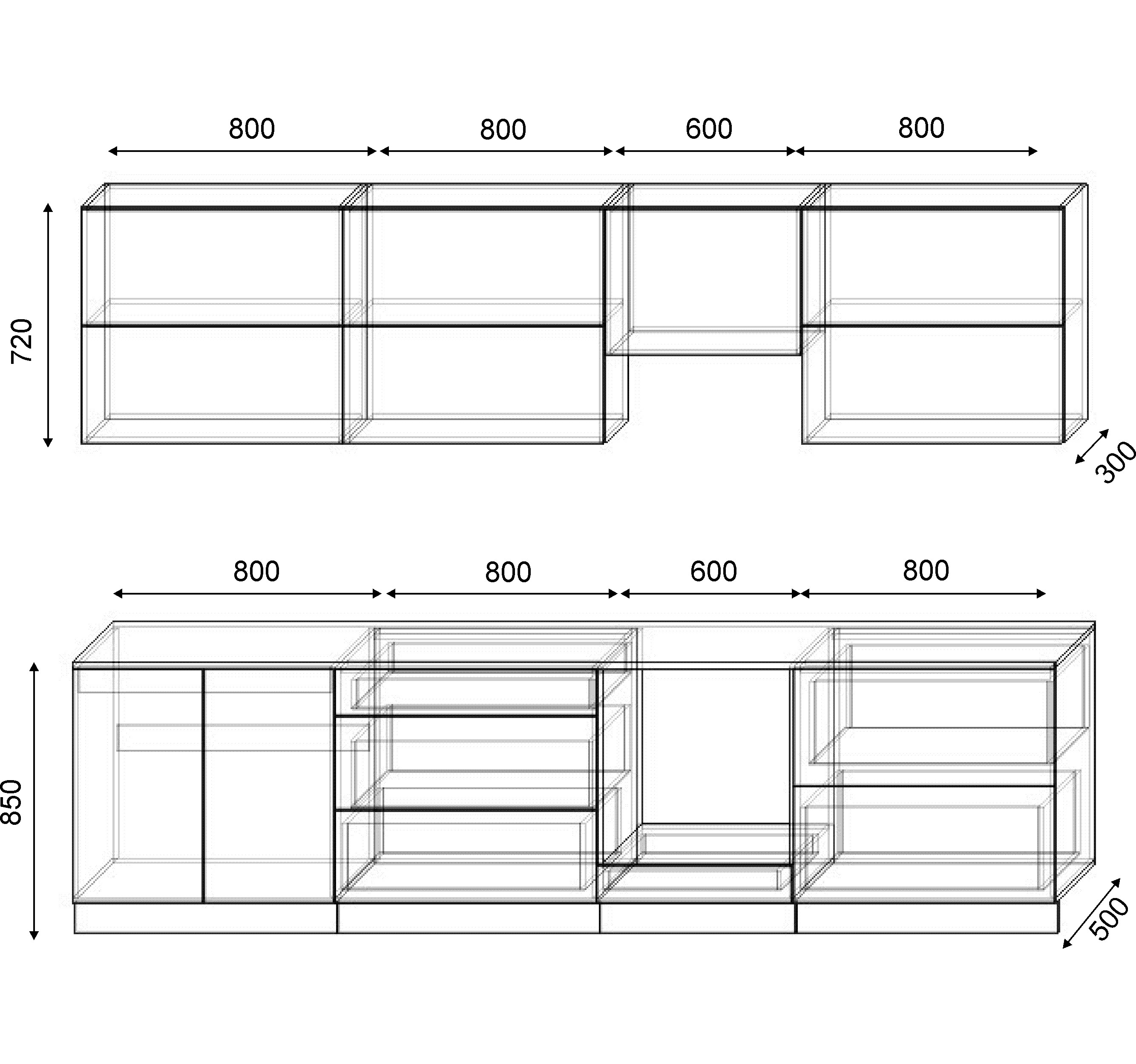 Варианты модулей: в данной коллекции представлены следующие размеры шкафчиков: 500мм, 600мм, 700мм, 800мм.