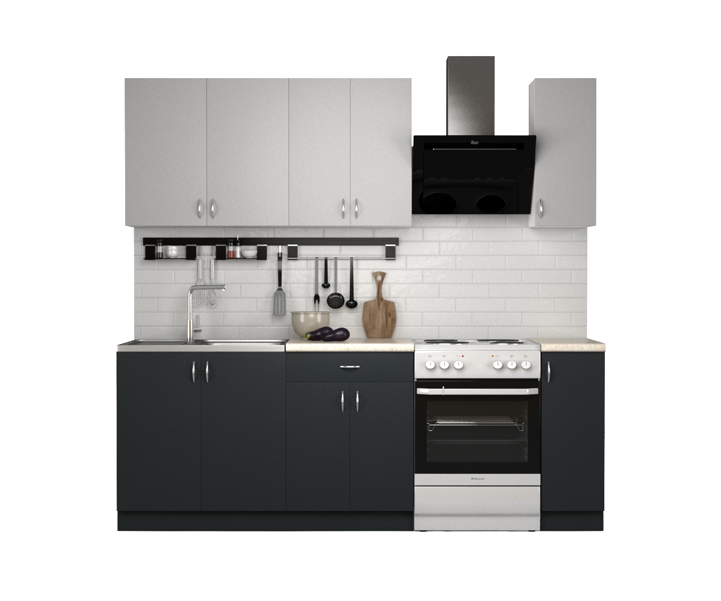 Матовые фасады с ручками из металла. Ширина кухни 180 см.