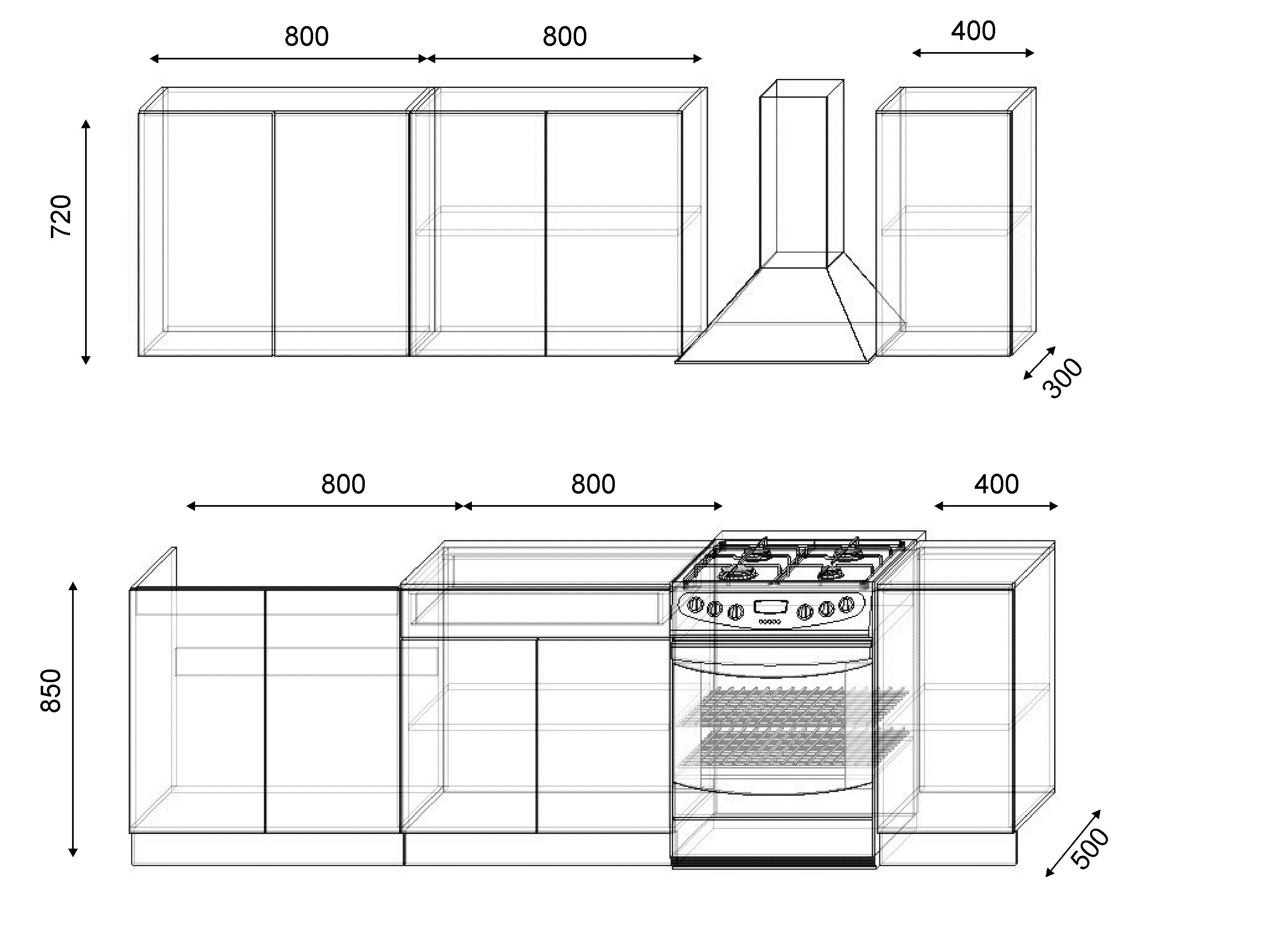 Варианты модулей: в данной коллекции представлены следующие размеры шкафчиков: 300мм, 400мм, 600мм, 800мм. В зависимости от размера кухонного гарнитура, варьируются размеры и функциональное содержание шкафчиков.