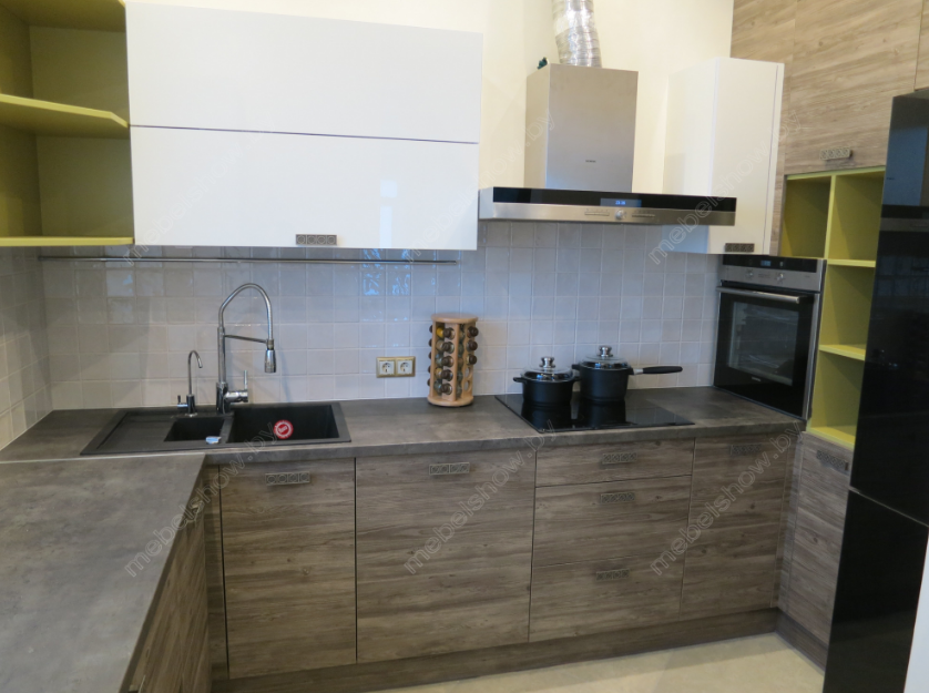Строгий массивный низ и столешница визуально облегчается вехним фасадом в светлых тонах. Открытые полки оливкового цвета гармонично сочетаются с белым акрилом.