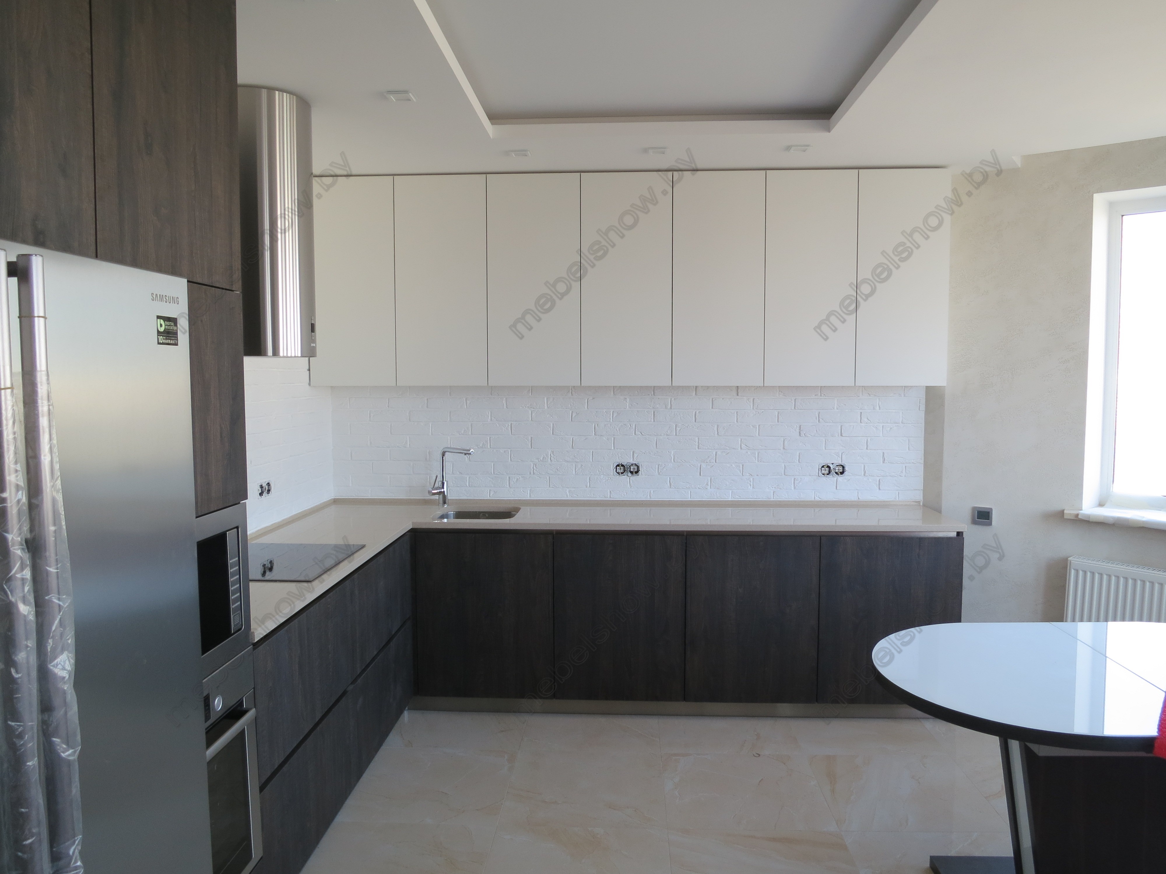Готовый гарнитур с комбинированными фасадами из ЛДСП. Ширина кухни 220 см.