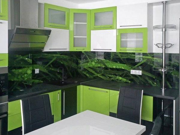 Презентабельная кухня для оригинального оформления кухонного пространства. Фасады глянцевые, выполнены преимущественно в зеленом и белом цветах. В конструкции использовано матовое стекло, также предусмотрена штанга для сушки посуды и бакалов.