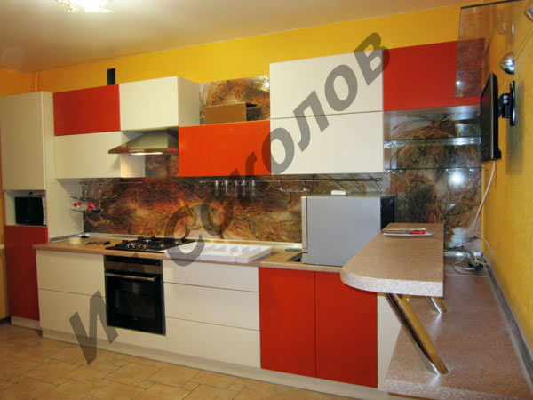 Благодаря контрастному сочетанию оранжевого и белого цвета яркая кухня станет оригинальным акцентом кухонного интерьера. В комплектацию также входит барная стойка. Цена варьируется в зависимости от размера, дизайна и комплектации.
