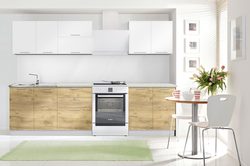 Комбинированная кухня оснащена навесной угловой столешницей. Ударопрочная столешница, изготовленная из постформинга, имитирует гранит. Стеклянные скинали декорированы оригинальной фотопечатью. Отсутствие дверных ручек – «изюминка» модели.