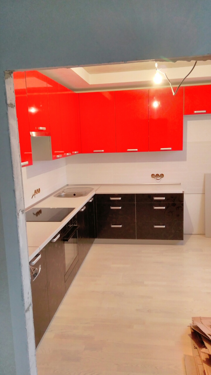 Прямая конструкция, полный комплект из навесных и напольных шкафов.