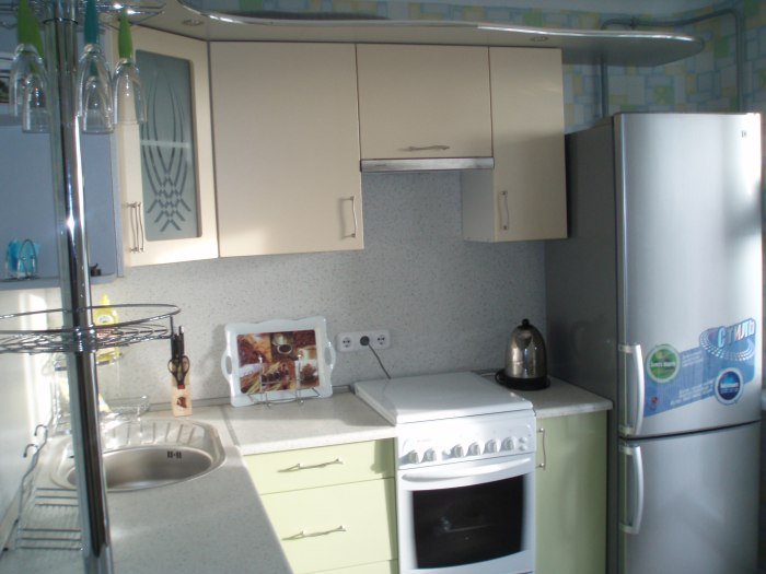 Кухня характеризуется своей угловой конструкцией и имеет компактные размеры, позволяющие размещать ее даже в малогабаритных помещениях. Боковина конструкции оснащена радиусными открытыми полками. Фасады шкафчиков выполнены в мягких постельных тонах – бледно-зеленый и бледно-желтый.
