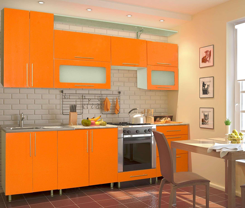 Современная кухня изготовлена из недорогих, качественных материалов и имеет линейную конструкцию, которая будет наилучшим вариантом для небольших помещений. Компактные размеры кухни никак не сказываются на довольно просторном рабочем месте хозяйки. Дизайн фасада имеет очень современный вид и окрашен в насыщенный оранжевый цвет, который добавляет солнечного настроения и теплой атмосферы.