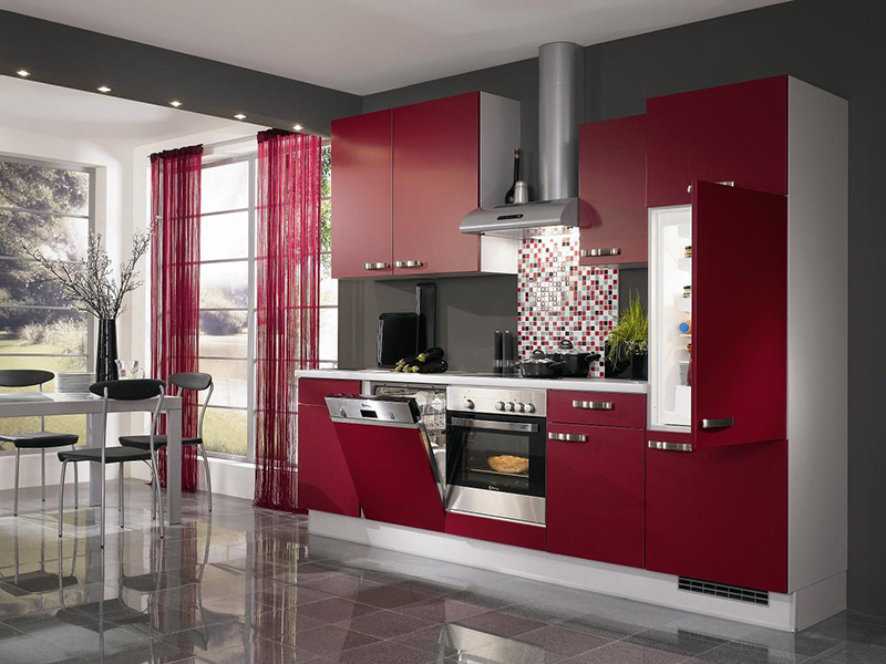 Модель современной кухни имеет линейную конструкцию, но идеально подойдет не только для небольших помещений, но и квартир-студий. Фасад выполнен в очень приятном винном цвете - бордо, и придает кухне очень изысканный и дорогой внешний вид. Металлическая фурнитура и светлая столешница разбавляют довольно темный фасад, не делая его слишком вычурным.