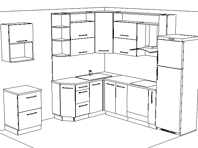 Угловая кухня обладает качественным функционалом, со множеством вместительных ящиков и шкафов для кухонной утвари. Максимальное заполнение пространства при малых площадях помещения за счет четко выверенной геометрии кухни. Светлое решение верхних пластиковых фасадов всегда увеличивает объем Вашей кухни.
