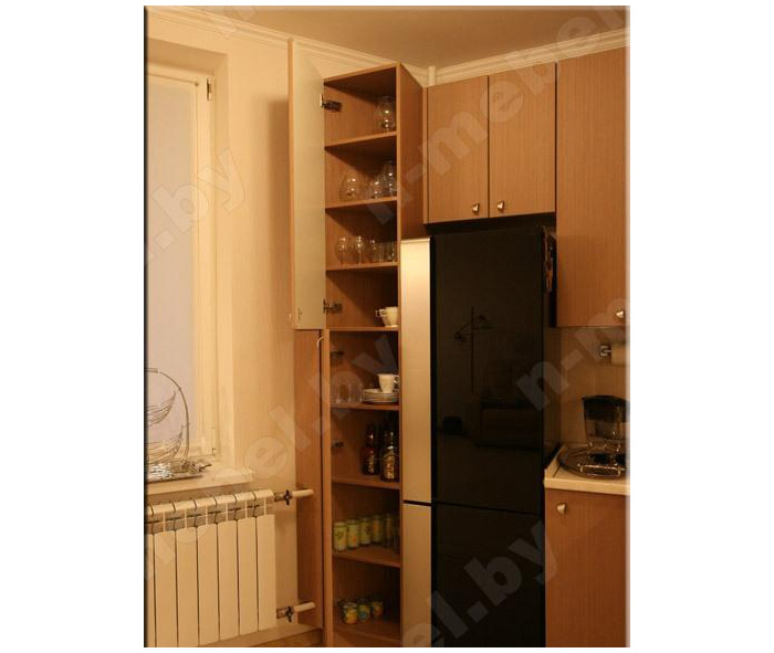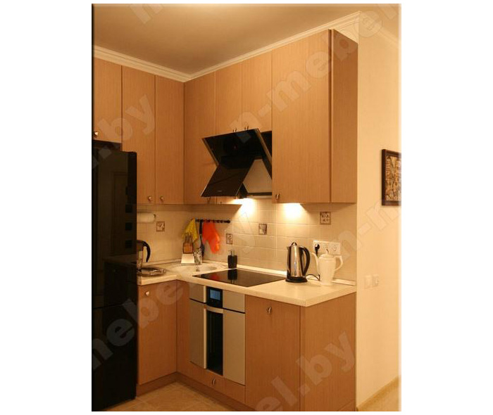 Кухня из ДСП, представленная в светло-коричневых тонах, отличается компактными размерами. Створки шкафчиков оснащены небольшими, но удобными ручками из металла. За счет использования качественных материалов и современной фурнитуры данная модель даже спустя время каждодневной эксплуатации не утратит своей функциональности и презентабельного внешнего вида.