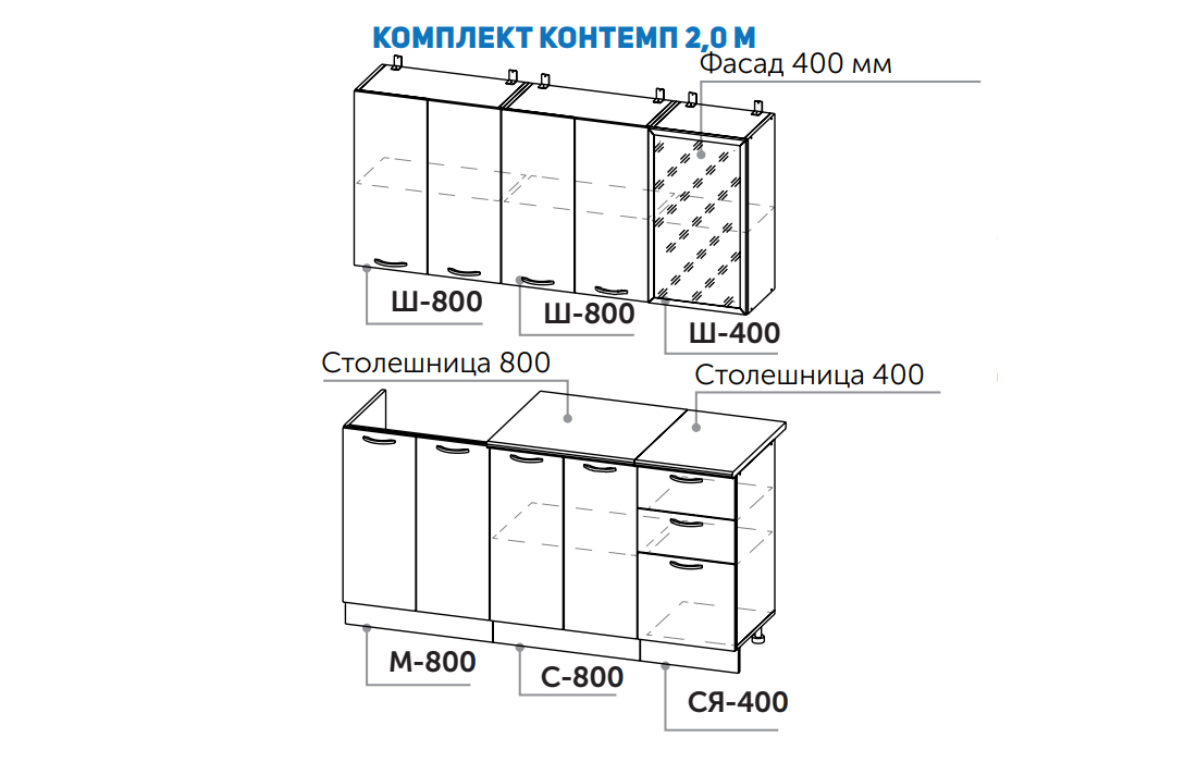 Комплектация: верх: Ш-800, Ш-800, Ш-400; низ: М-800, С-800, СЯ-400 (размеры см. прикрепленную картинку)