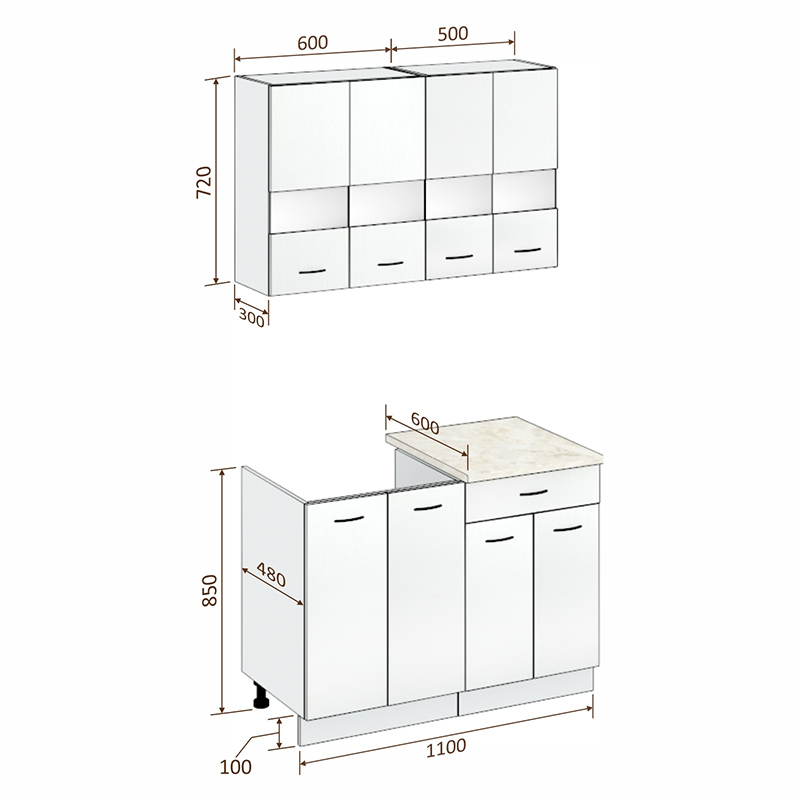 код 113467Материал корпуса и фасадов – ЛДСП. Ширина кухни 110 см.