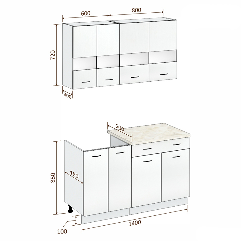 Общая ширина кухни: 140 см.