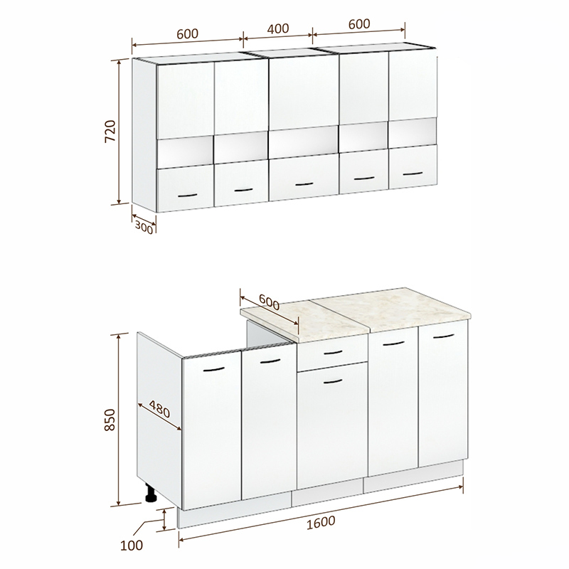 Материал фасада и корпуса: ЛДСП 16 мм. Ширина кухни 160 см.