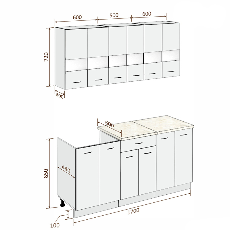 код 113516Материал корпуса и фасадов – ЛДСП. Ширина кухни 170 см.