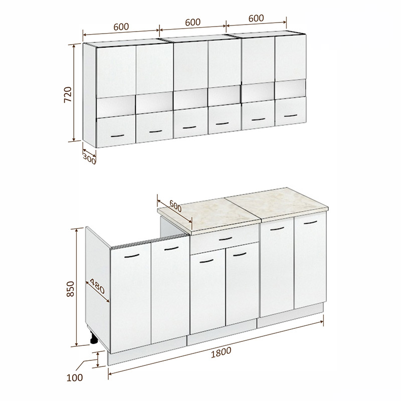 - Нижний шкаф с 2-мя полками, ШхГхВ: 60x60x85 см. Оснащен столешницей.