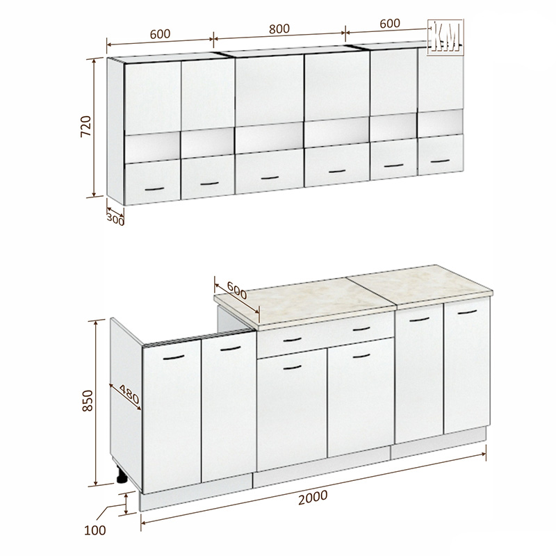 - Нижний шкаф под установку накладной мойки (в комплект не входит) с отделением для хранения, ШхГхВ: 60x48x85 см.