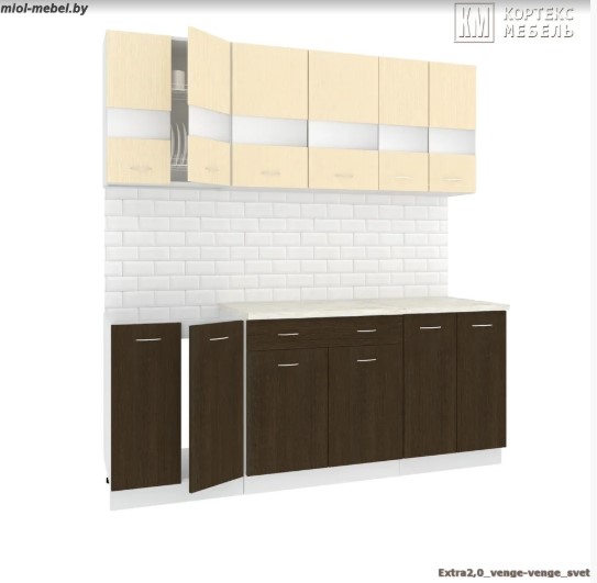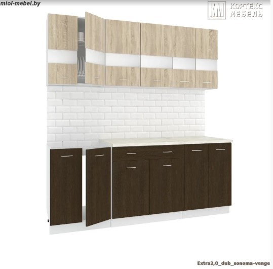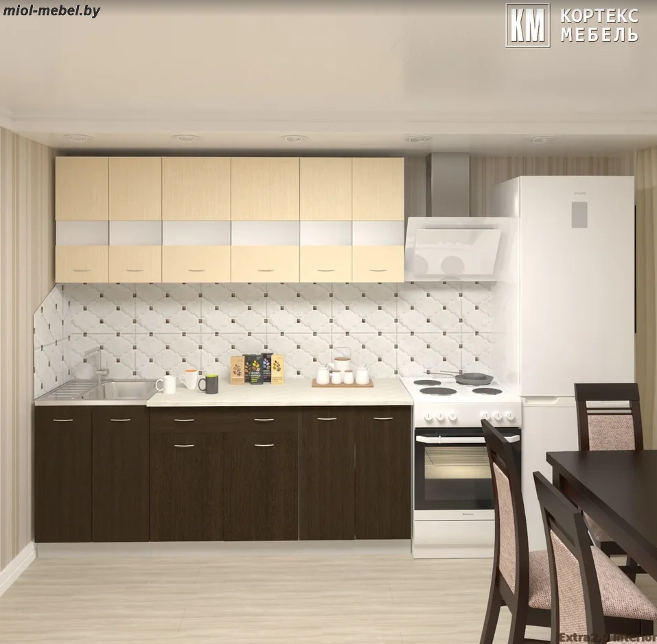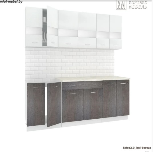 Готовый гарнитур с комбинированными фасадами из ЛДСП. Ширина кухни 230 см.