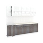 Закрытые полки, тумба с тремя выдвижными ящиками.