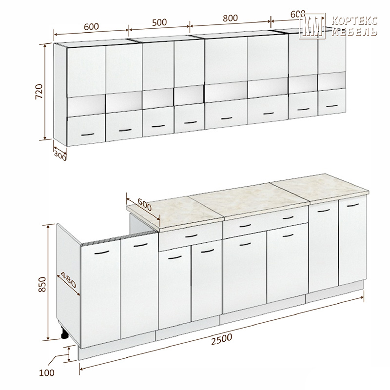 - Нижний шкаф с 2-мя полками внутри, ШхГхВ: 60x60x85 см. Оснащен столешницей.