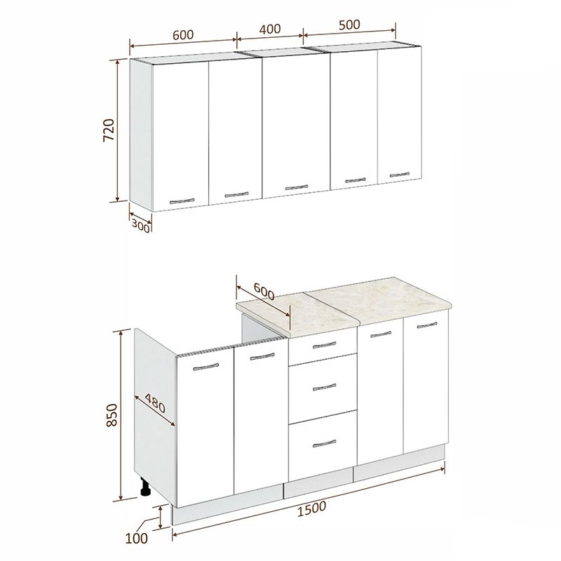 Столешница: постформинг 26 мм, отдельная на каждый шкаф.