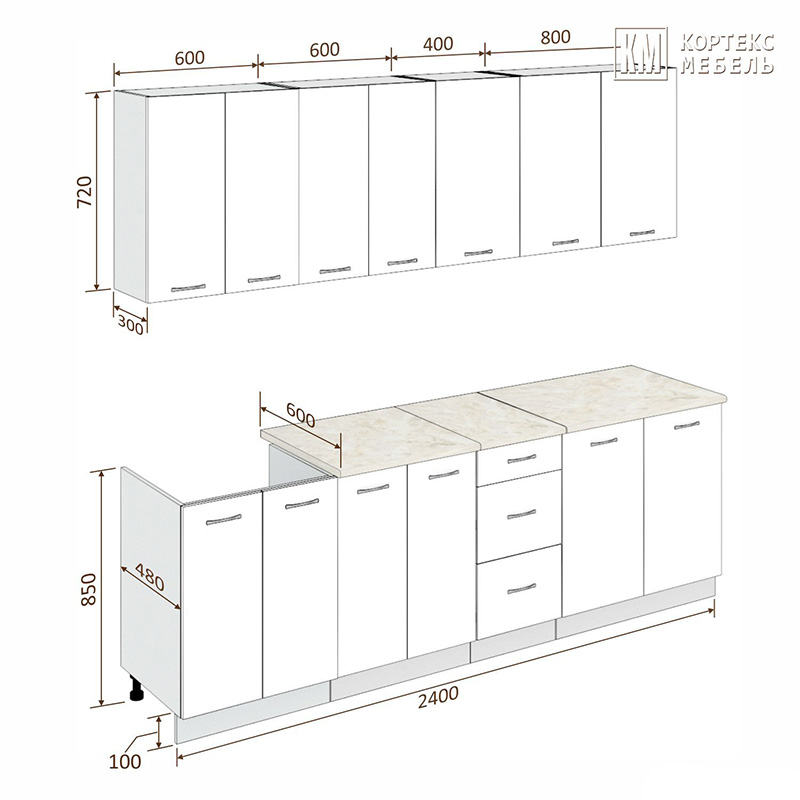 Столешница: постформинг 26 мм, отдельная на каждый шкаф.