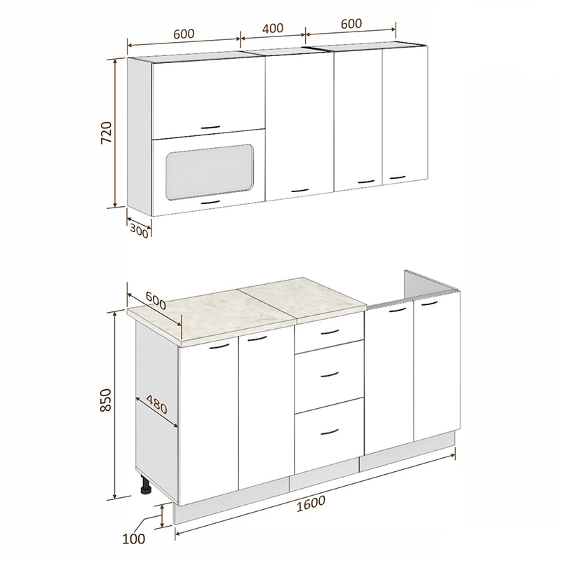 Материал фасада и корпуса: ЛДСП 16 мм. Ширина кухни 100 см.