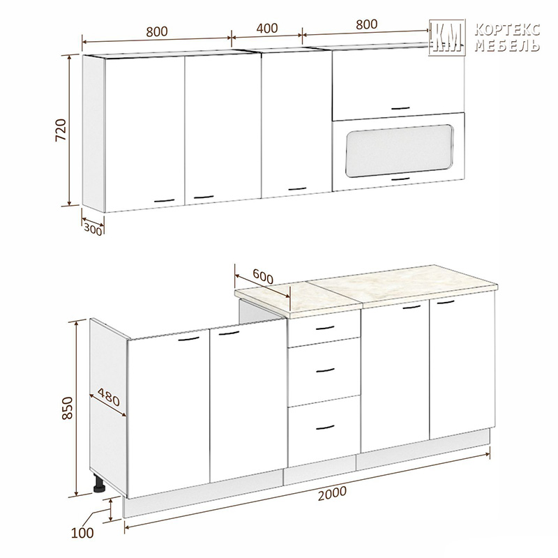 Столешница: постформинг 26 мм, отдельная на каждый шкаф.