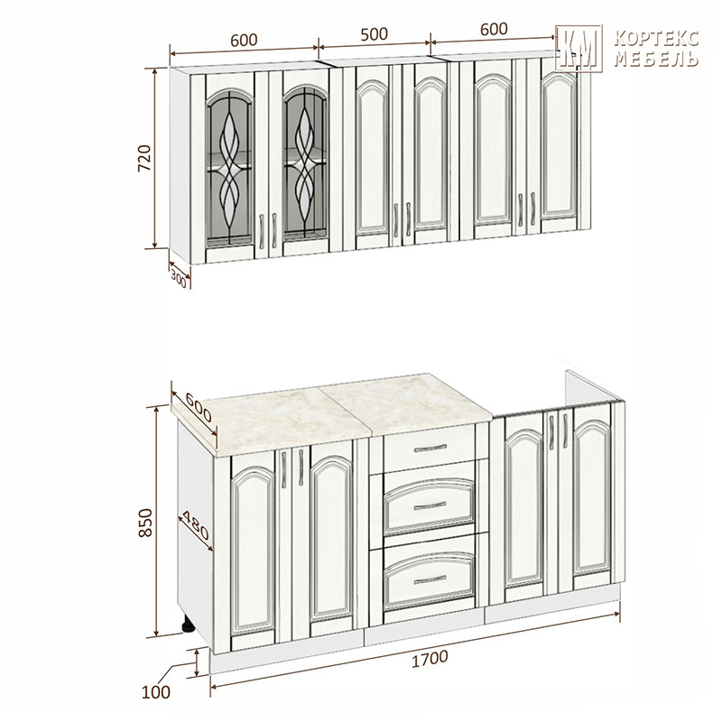 Материал корпуса: ЛДСП. Материал столешницы: постформинг. Материал фасада: МДФ. Вставки из стекла