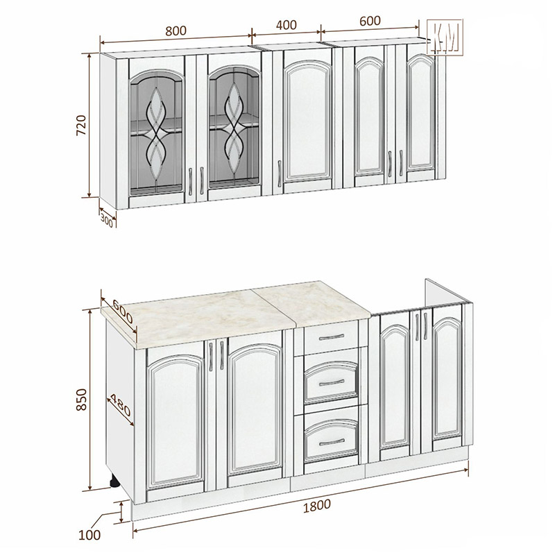 Общая ширина кухни: 180 см.