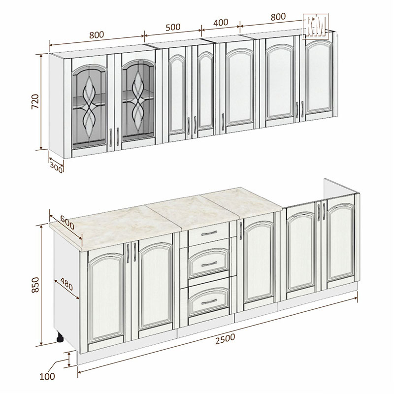 Прямая конструкция, полный комплект из навесных и напольных шкафов.
