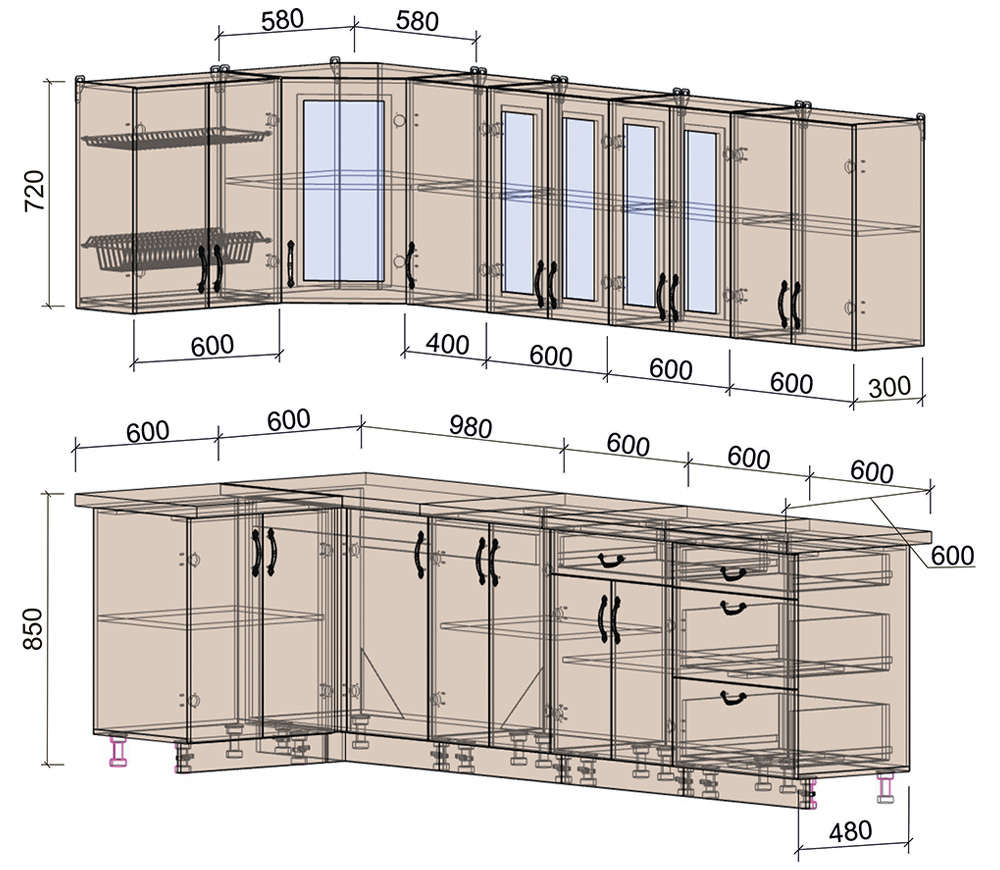 Практичное наполнение шкафов. Столешница в комплекте.