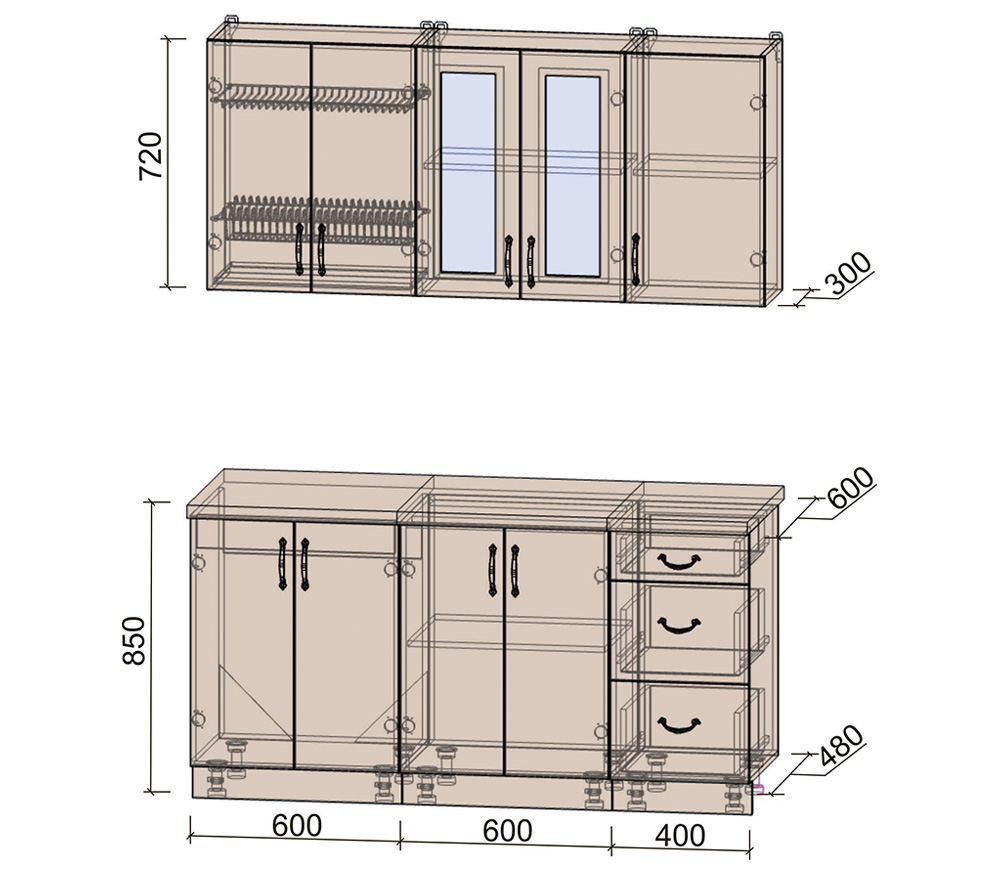 Интегрированные ручки, ниши для техники, нежное сочетание оттенков.