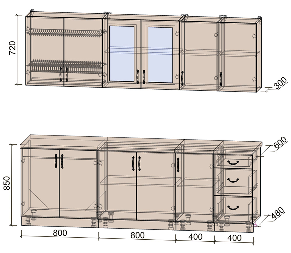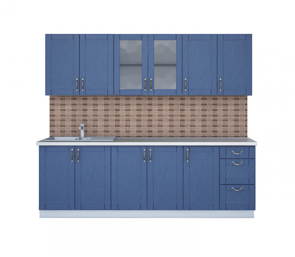 Материал фасада и корпуса: ЛДСП 16 мм. Ширина кухни 210 см.