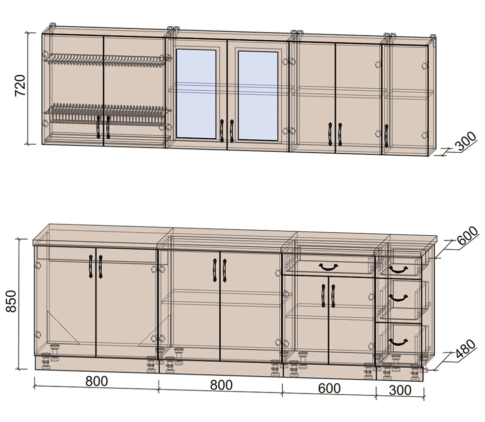 Комбинированные фасады, интегрированные ручки, механизм открывания нажатием.