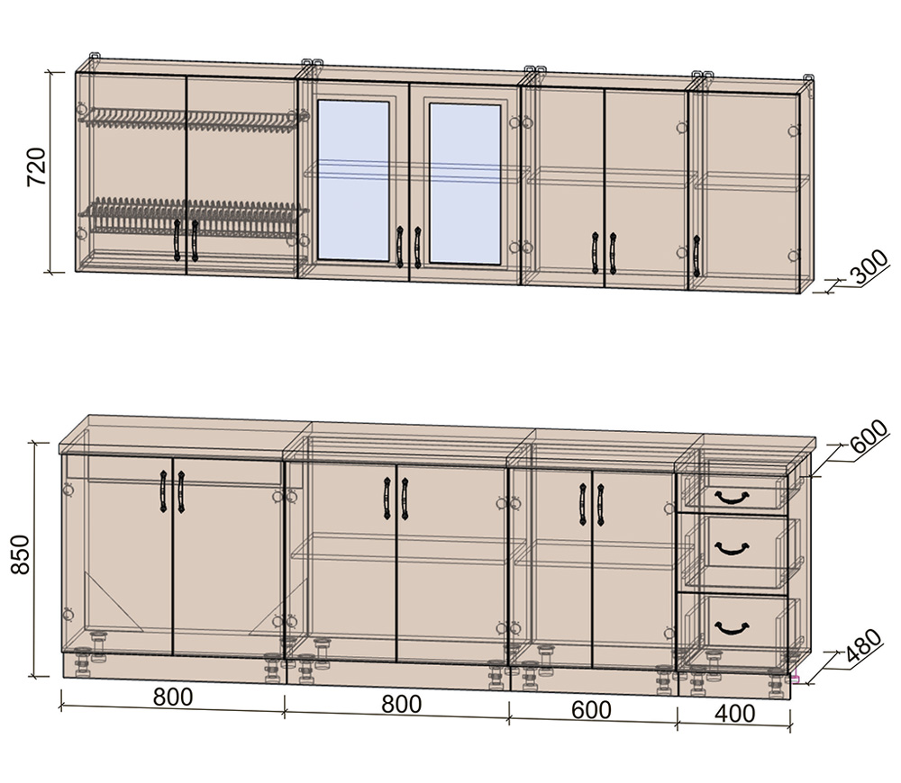 Материал фасада и корпуса: ЛДСП 16 мм. Ширина кухни 110 см.