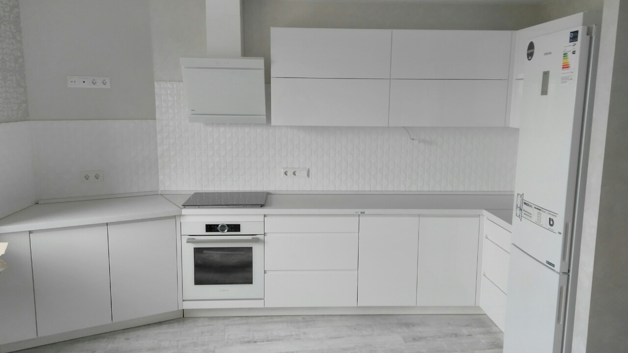 Фасады белого цвета. Столешницы - сонома.
