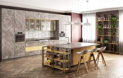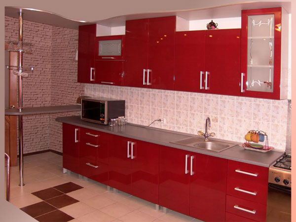 Линейная кухня дополнена барной стойкой с подставками для бокалов и фруктов. Фасады окрашены в красный цвет, часть из них декорирована вставками из стекла с узорами. Гарнитур комплектуется ударопрочной столешницей серого цвета.