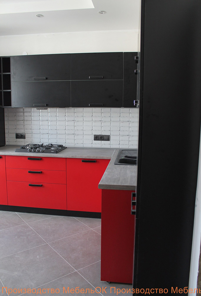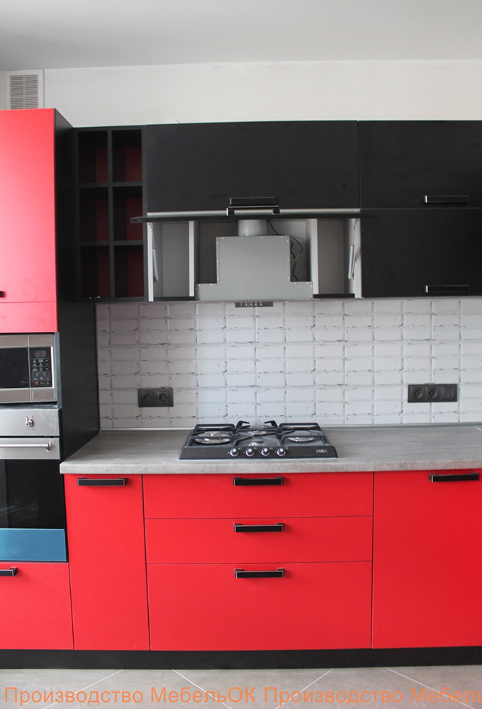 Кухня длиной 240 см. Сочетание яркого и темного цвета фасадов.
