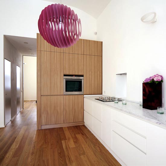 Кухонный гарнитур выполнен из МДФ покрытого эмалью и МДФ шпонированного, фурнитура фирмы BLUM. Сочетание деревянного декора с глянцевой эмалью выгодно подчеркивает текстуру дерева. Современный и стильный вид кухня имеет благодаря отсутствию ручек. Мебель снабжена фурнитурой высокого качества, поэтому пользоваться ею очень удобно, легко и приятно.