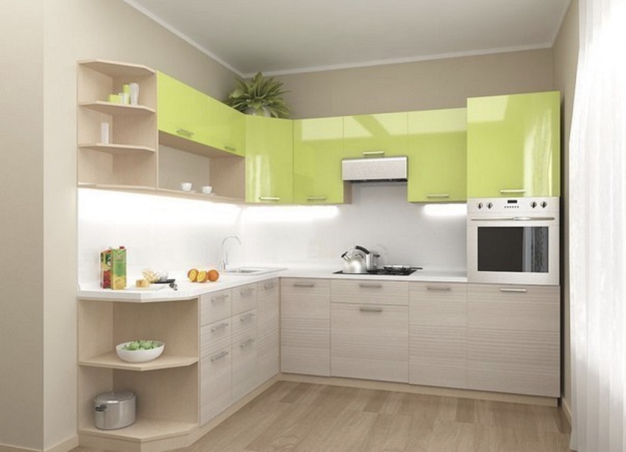 Кухня «Лайм» выполнена в сочетании двух цветов. Напольные тумбы имеют молочно-бежевый оттенок светлой древесины, а глянцевые фасады подвесных шкафчиков исполнены в светло-зеленом цвете лайма. Угловая конструкция удачно дополнит интерьер небольшой кухни. Во внешнем торце полки с усеченным углом. Фурнитура, подъемные механизмы - Петли с доводчиком GTV,газ-лифты. Используемые направляющие - шариковые.