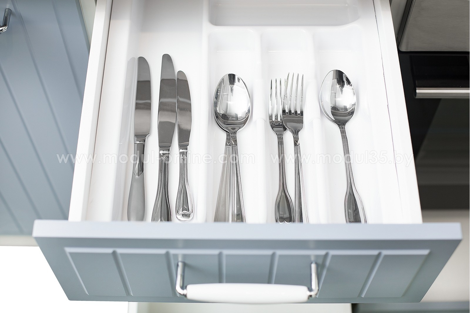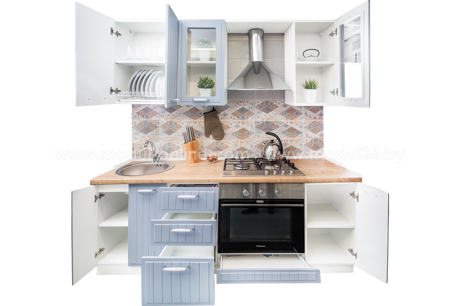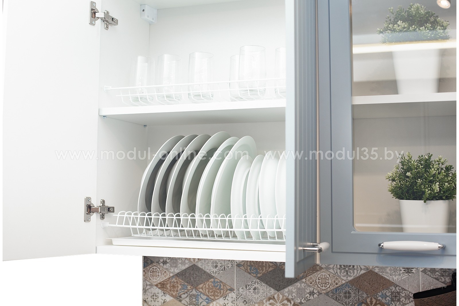 - Комплект поставки. Нижние и верхние кухонные модули, фасады (каждый в отдельной упаковке), цоколь, защитный профиль, столешница, пристенный плинтус + заглушки, сушка, ручки, соединительные планки.