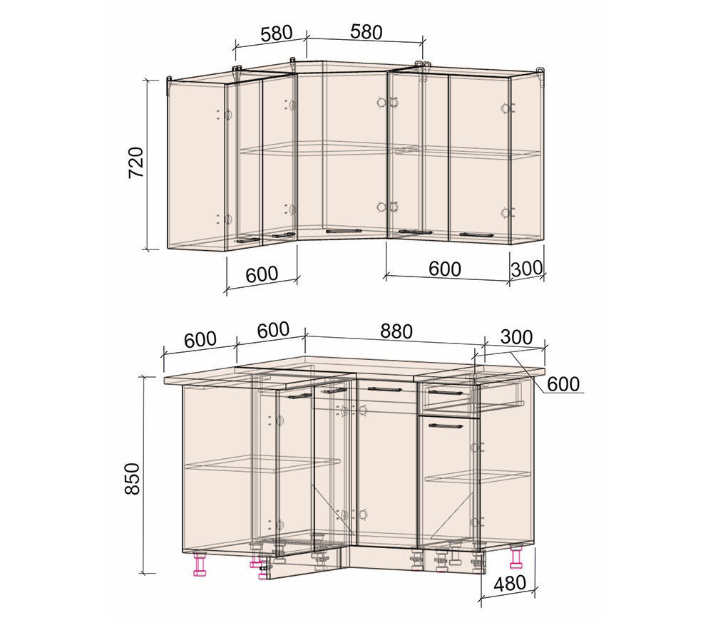 Поскольку кухня собрана модульно, шкафы все являются отдельностоящими, тем самым давая возможность их менять между собой местами. Дополнительно любой набор можно доукомплектовать шкафом под вытяжку (шириной 500мм или 600мм) и под встраиваемую духовку. Так-же в качестве хорошего завершения угловых кухонь предлагаются угловые модули НПз30 и ВПз30. Важно при заказе уточнить левые или правые. Кому необходимо больше пространства для хранения, предлагаем дополнить кухню пеналом, шириной 400мм.