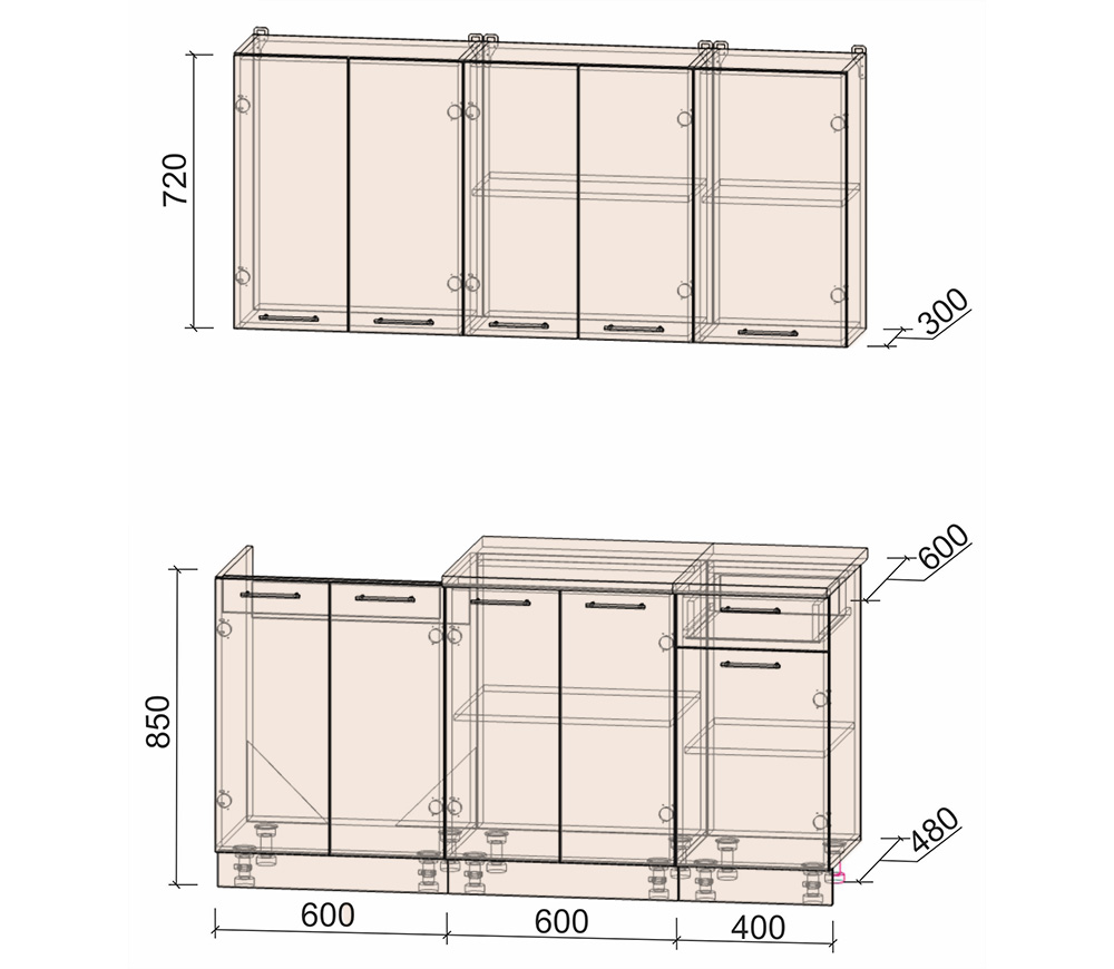 Данные кухни предлагаются только в стандартных комплектациях. Кухни “Лайт” комплектуются отдельными на каждый шкаф столешницами толщиной 26мм в декоре “Малага”.