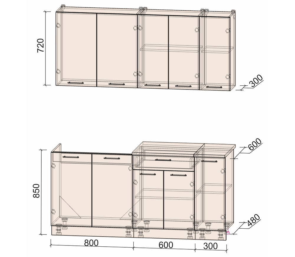 Поскольку кухня собрана модульно, шкафы все являются отдельностоящими, тем самым давая возможность их менять между собой местами. Дополнительно любой набор можно доукомплектовать шкафом под вытяжку (шириной 500мм или 600мм) и под встраиваемую духовку. Так-же в качестве хорошего завершения угловых кухонь предлагаются угловые модули НПз30 и ВПз30. Важно при заказе уточнить левые или правые. Кому необходимо больше пространства для хранения, предлагаем дополнить кухню пеналом, шириной 400мм.