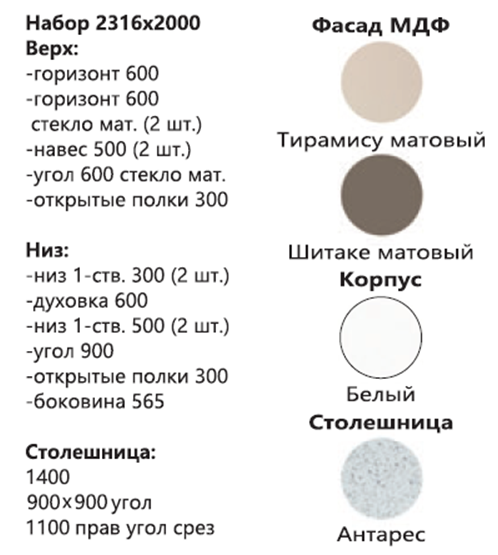 Материал фасада и корпуса: ЛДСП 16 мм. Ширина кухни 230 см.