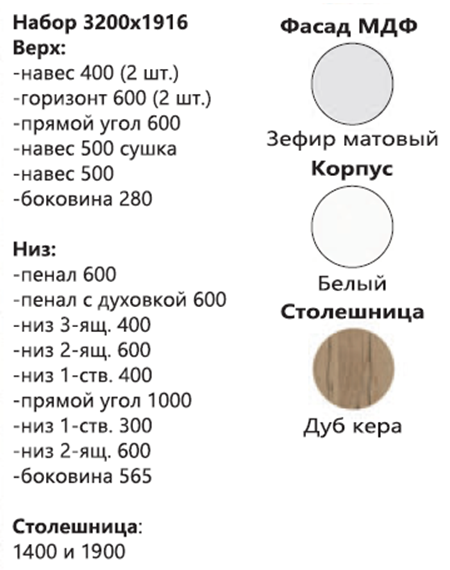 Материал корпуса и фасадов – ЛДСП. Ширина кухни 150 см.