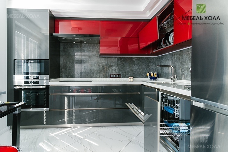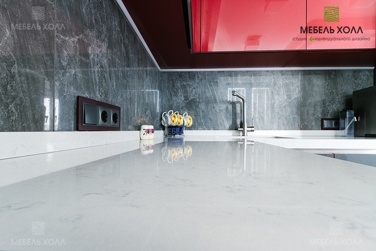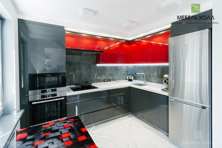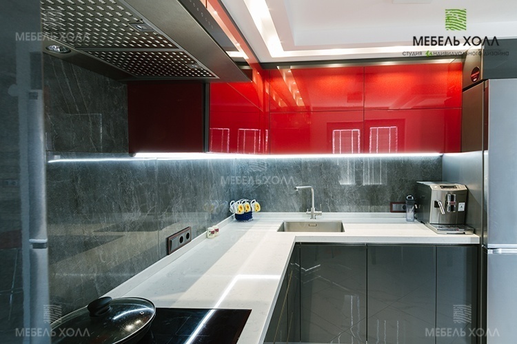Встроенная угловая кухня из ДСП и акрила Alvic. Столешница и барная стойка выполнены из искусственного камня (кварца), над рабочей зоной встроена подсветка. Фурнитура Blum. Гарнитур изготовлен в футуристичном стиле хайтек, в изящном сочетании нейтрального серого и темно-красного интенсивного глянца. Торцевой шкаф оборудован нишами для духовки.