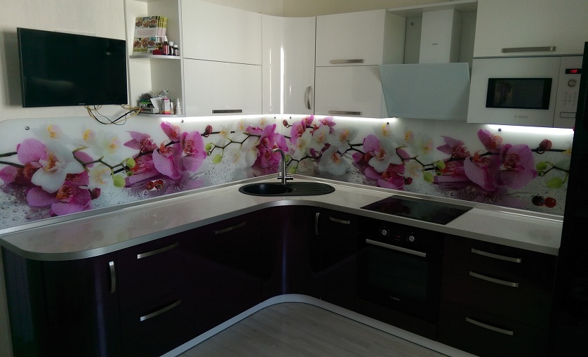 Кухня отличается нестандартным внешним видом, подчеркнутым необычным сочетанием цветов. Верхние фасады окрашены в белый глянец, нижние в сливовый. Гарнитур также оборудован фартуком, выполненным с фотопечатью белых и розовых орхидей.